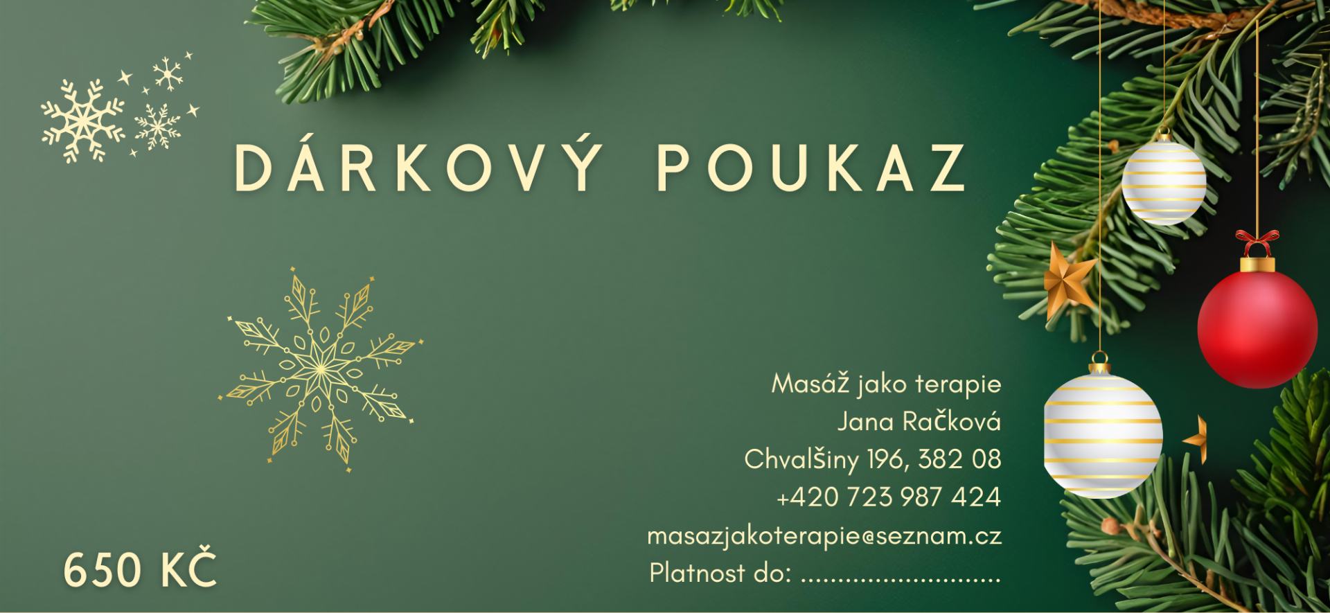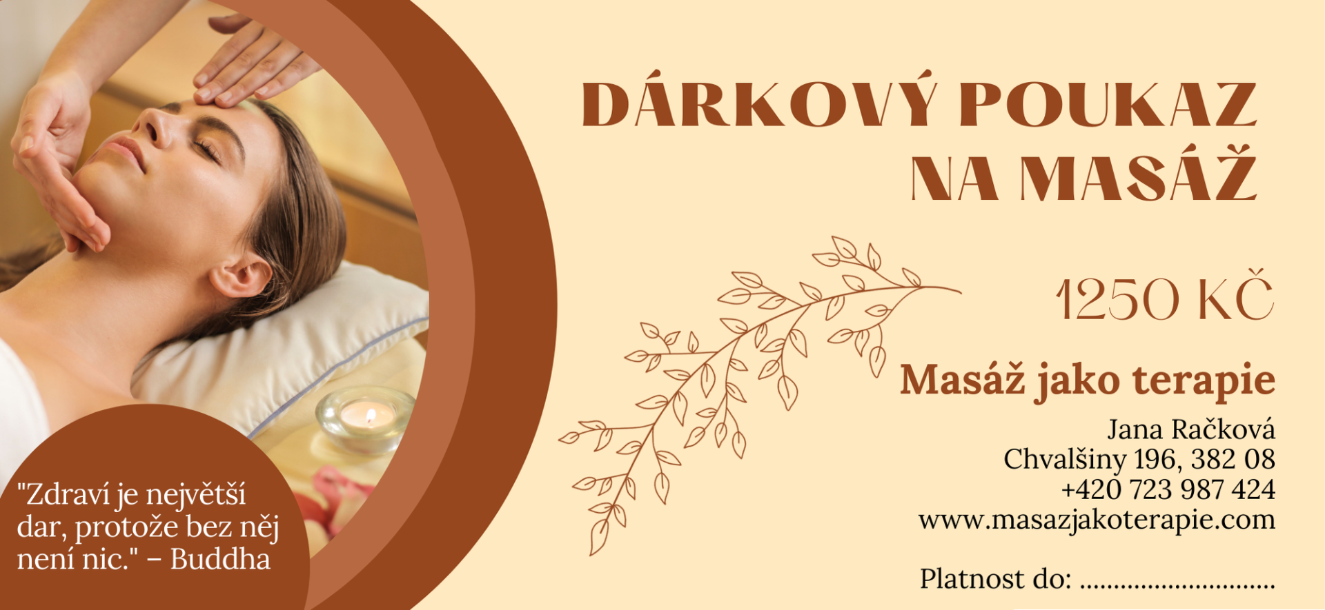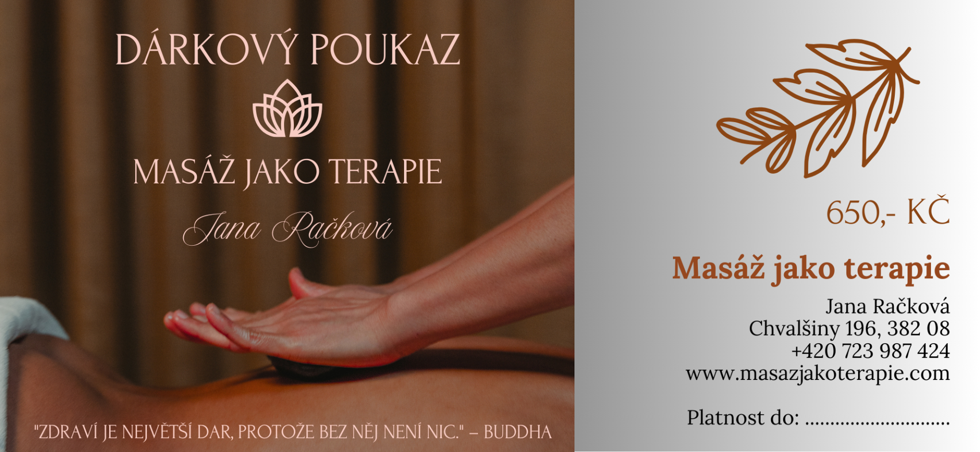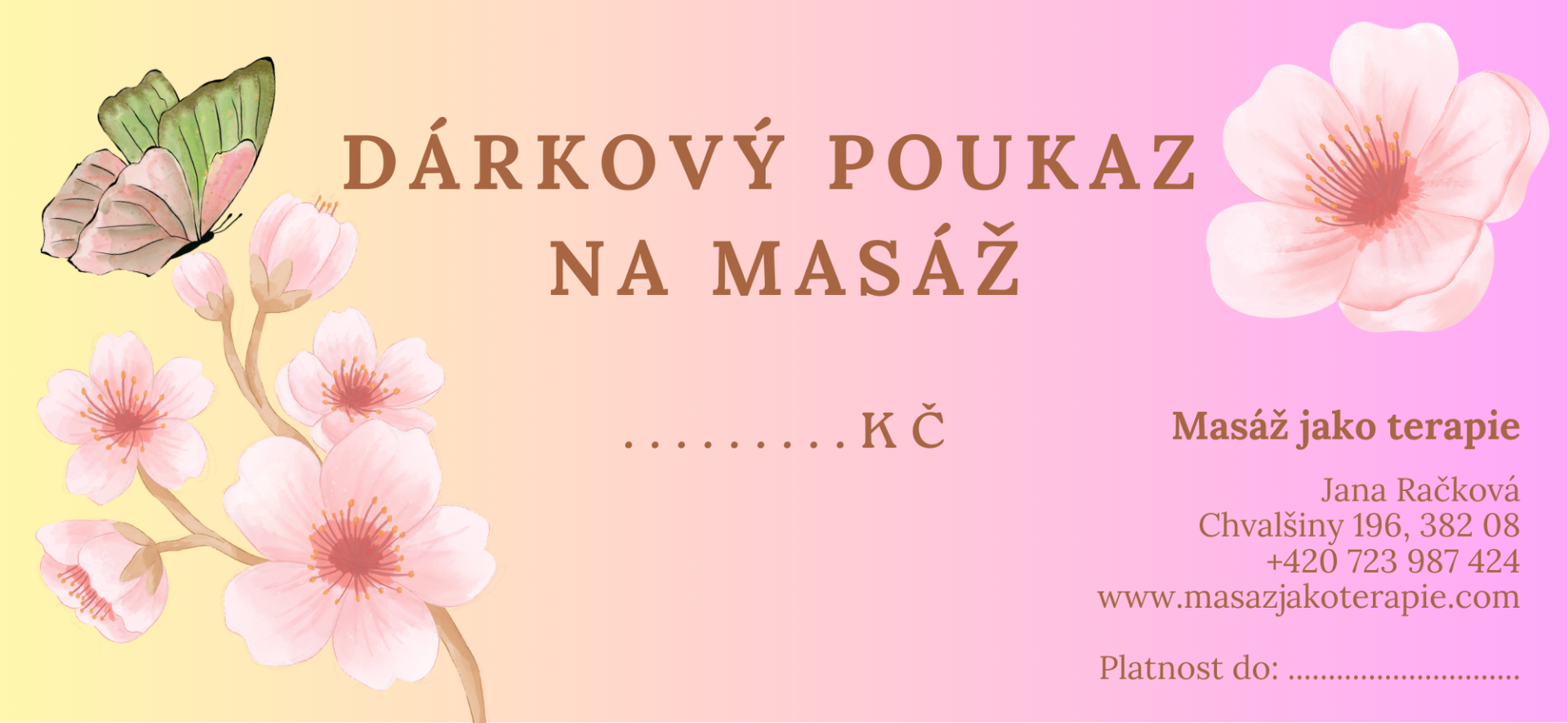 - Dárkový poukaz si můžete zakoupit osobně na mé masérně nebo si o něj zažádat na emailu: masazjakoterapie@seznam.cz